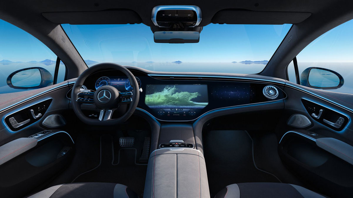 Bước vào khoang xe EQS 580 4MATIC như đang bước vào một không gian của sự hoàn mỹ cấp tiến. Siêu màn hình MBUX trải dài theo chiều rộng khoang lái. Ẩn sau đó là màn hình hiển thị LCD cho ghế lái, màn hình đa phương tiện trung tâm và màn hình cho ghế hành khách với công nghệ OLED.